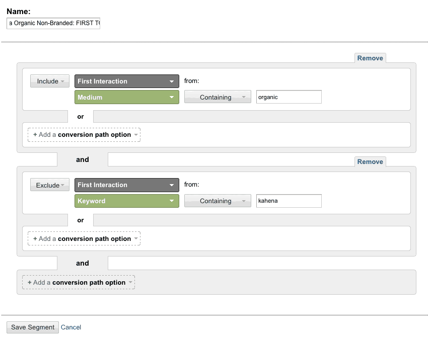 Note: You can do this same advanced segment for First Touch organic branded, First Touch paid: non-branded, or First Touch paid: branded. For our purposes the one that really matters is this First Touch organic non-branded.